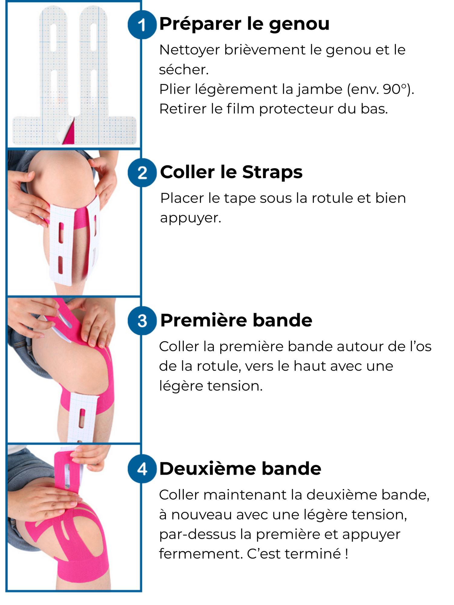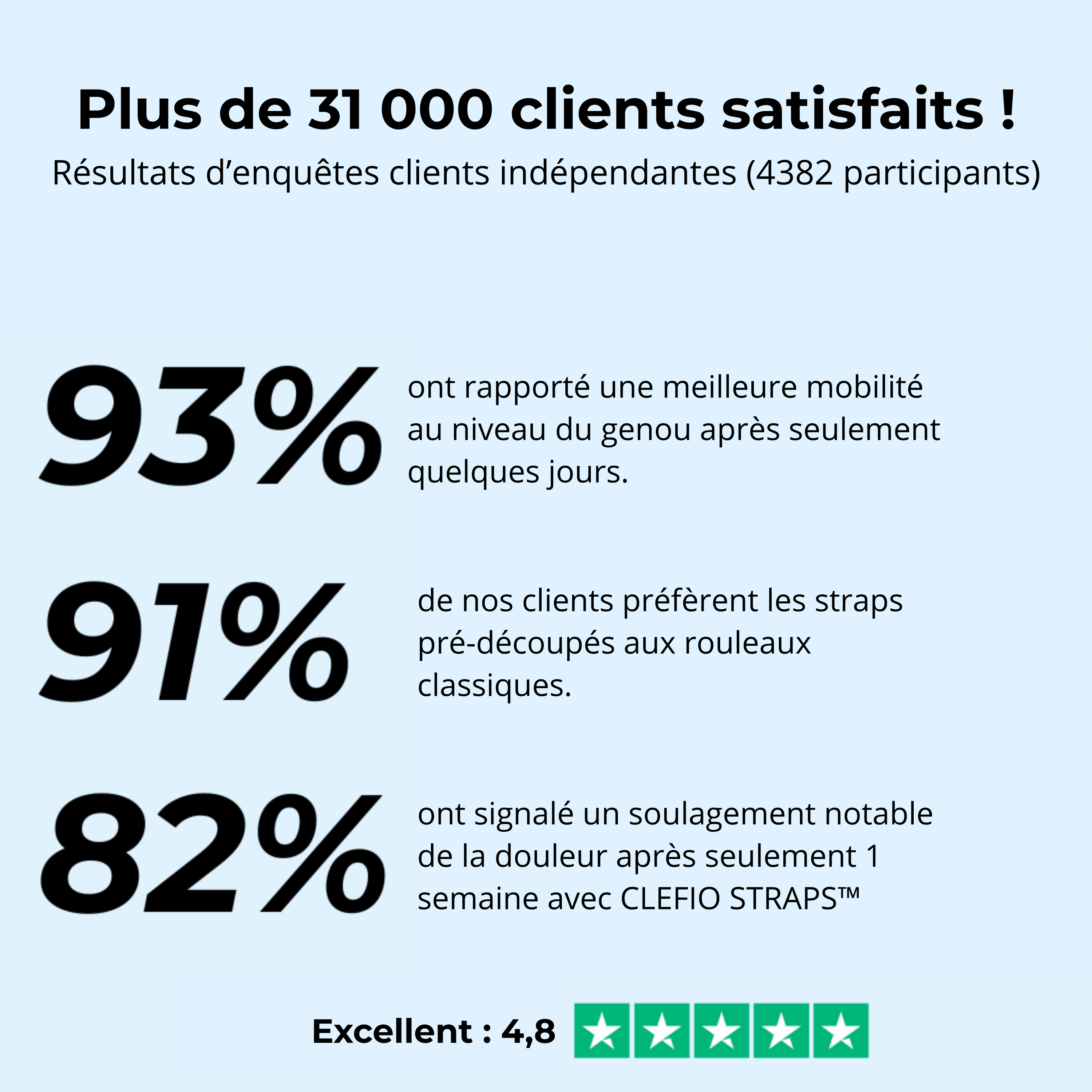 Non ! C'est précisément pour cela que CLEFIO STRAPS™ a été développé. Nos bandes sont prédécoupées et anatomiquement préformées pour s'adapter parfaitement à votre genou aucune connaissance médicale préalable n'est requise. Il vous suffit de les appliquer leur forme astucieuse et le matériau élastique fait le reste. Pas de YouTube, pas de découpe, pas de tâtonnements.